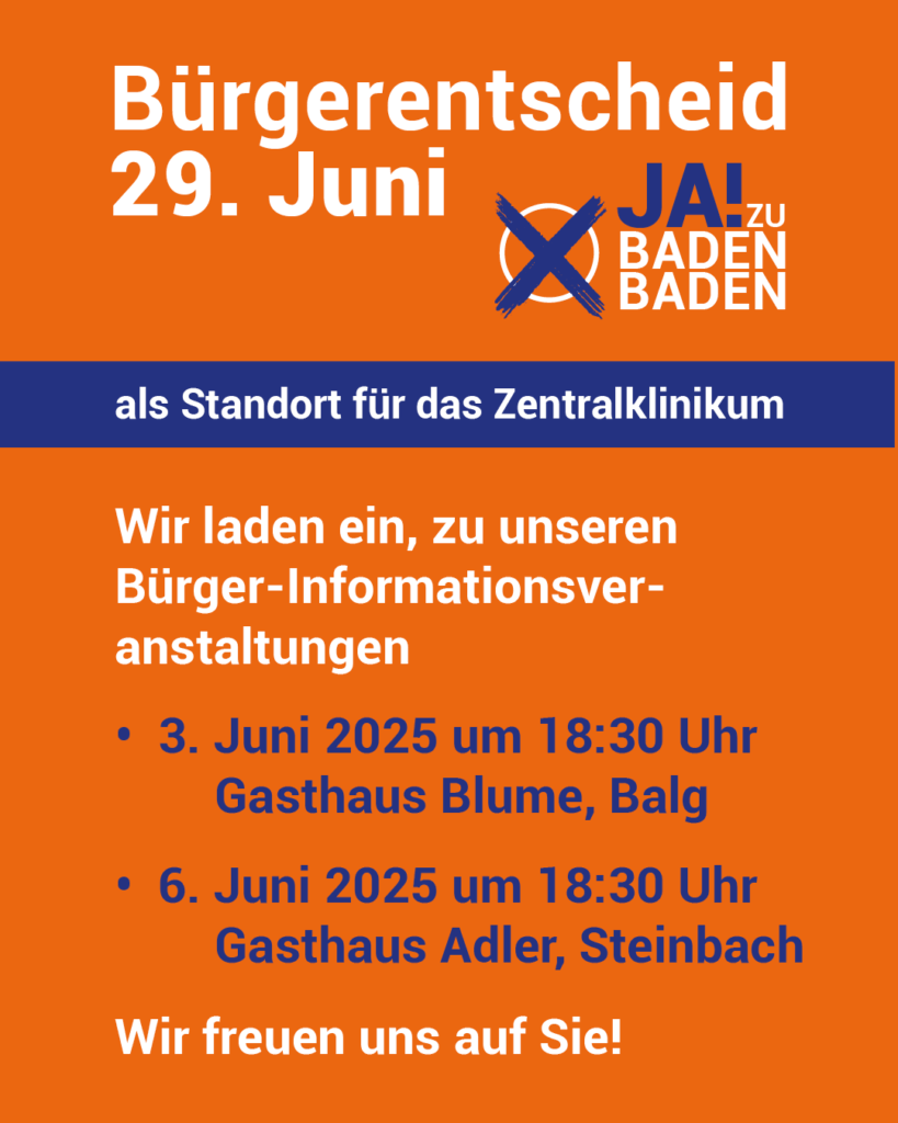 Der Verein Für Baden-Baden e. V. lädt alle interessierten Bürgerinnen und Bürger herzlich zu zwei Informationsveranstaltungen rund um den anstehenden Bürgerentscheid zum Standort eines zukünftigen Zentralklinikums ein.