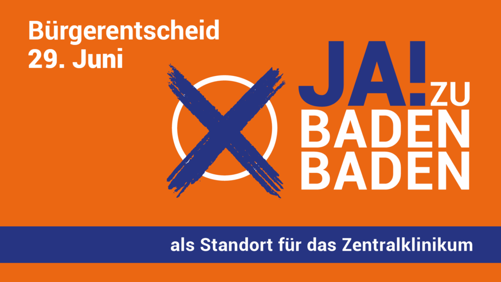 Es ist über folgende Frage abzustimmen: «Sind Sie dafür, dass die am 25.11.2024 vom Gemeinderat gefassten Beschlüsse 1, 3 und 9 unter Tagesordnungspunkt 7 aufgehoben werden und die Stadt Baden-Baden dem Bau eines neuen Zentralklinikums nur unter der Maßgabe zustimmt, dass Baden-Baden dessen Standort ist?»